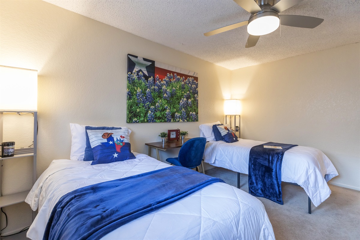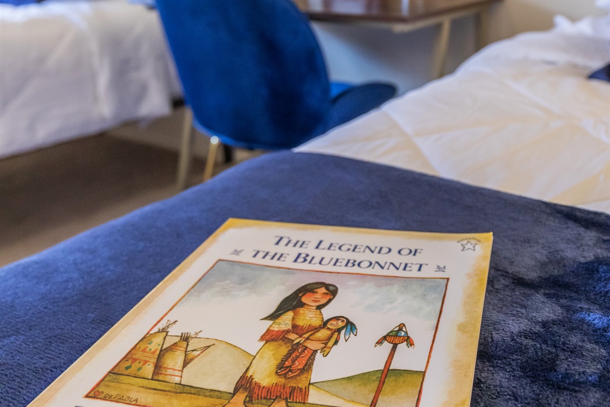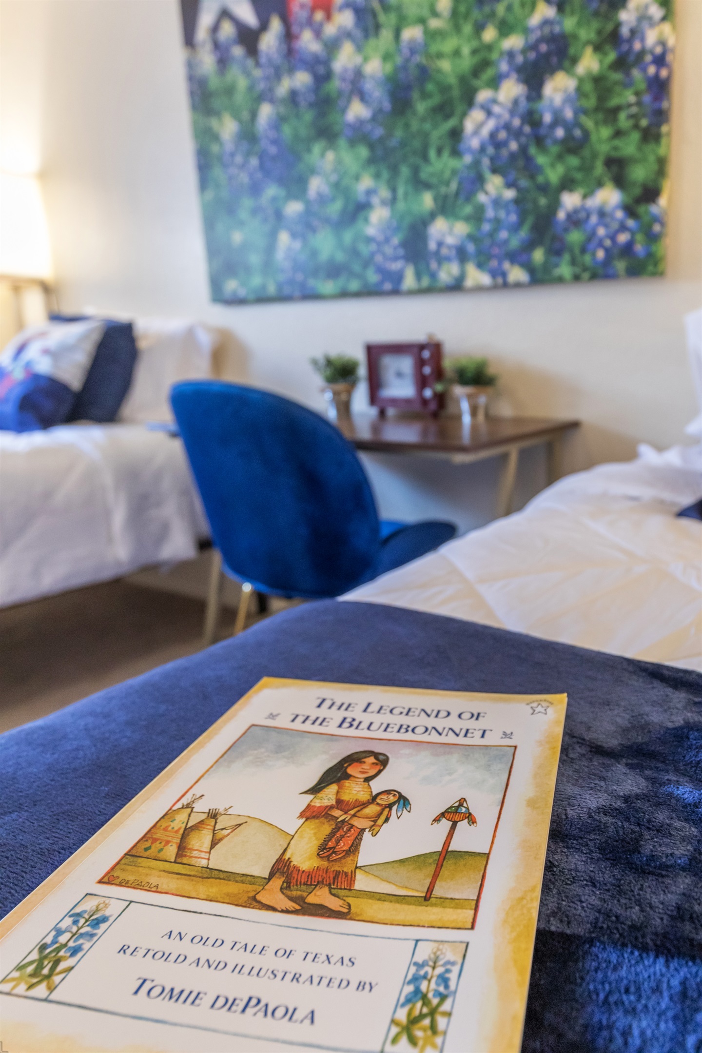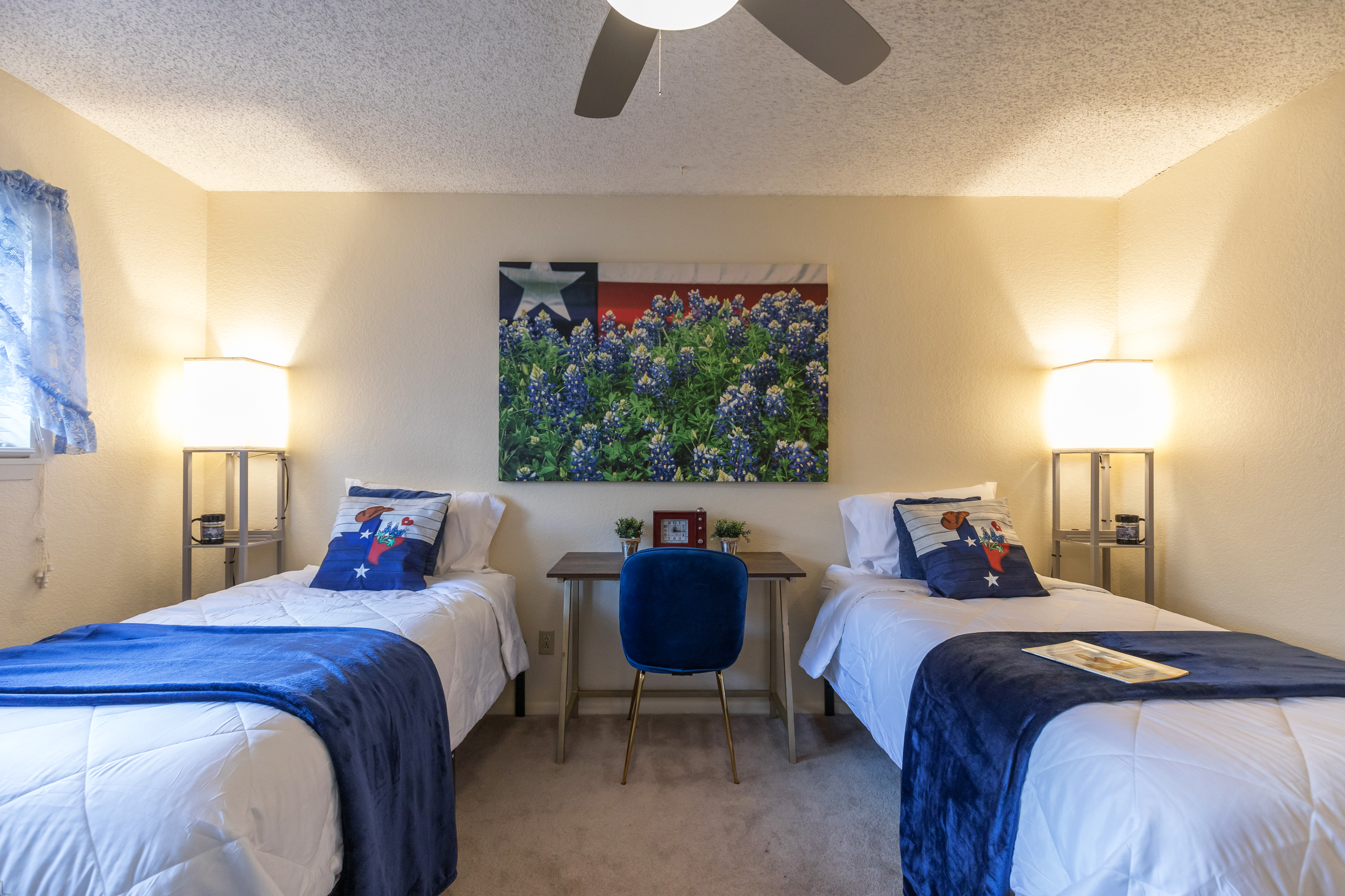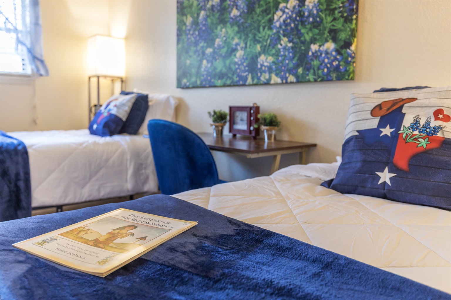 A bright, cozy retreat featuring a bold Texas bluebonnets canvas above a rustic wood desk with a royal-blue velvet chair — perfect for a quiet morning coffee or remote work. Queen bed, warm carpet, and bedside lamp. Sleeps 2.