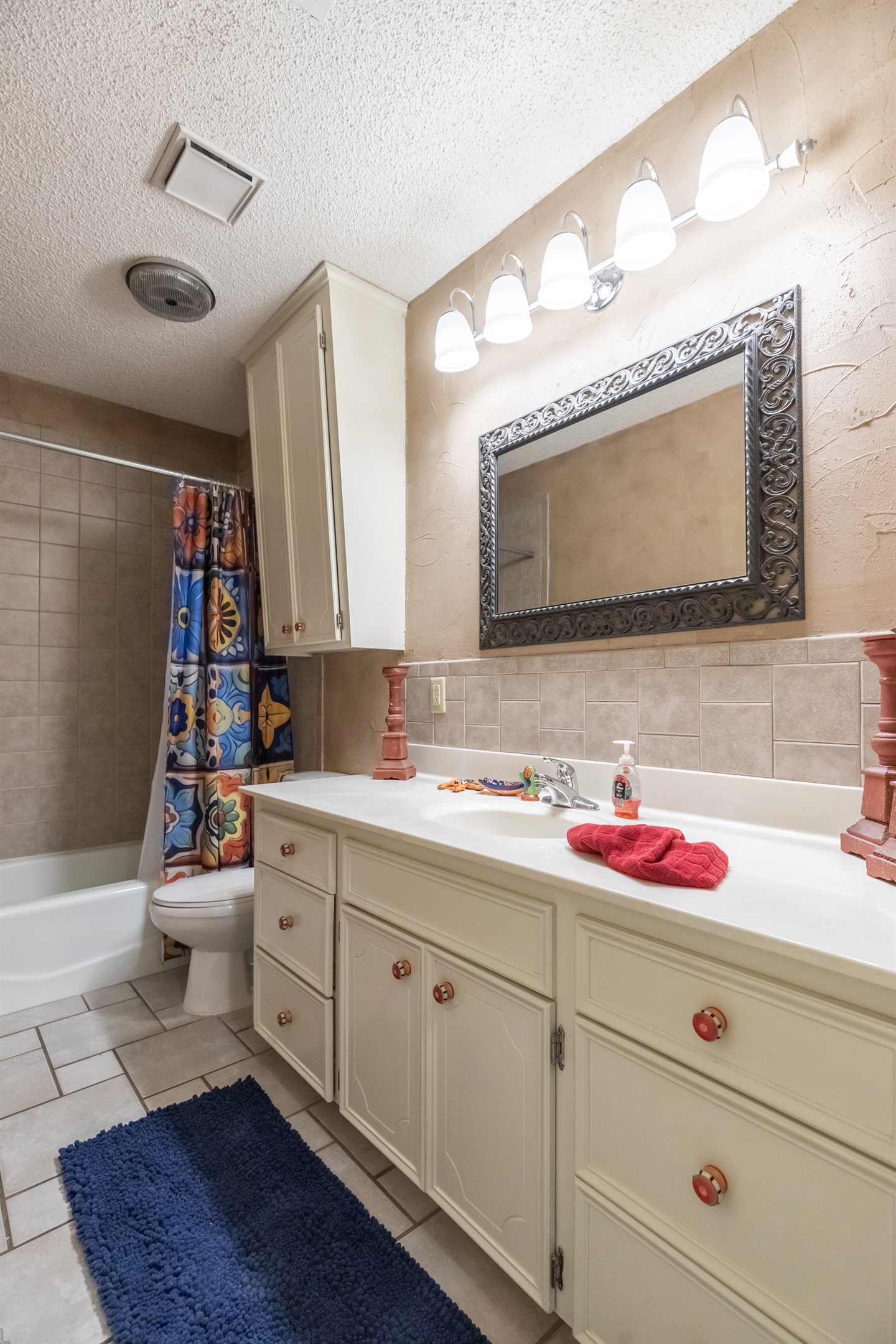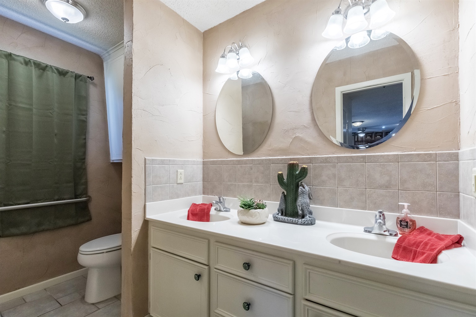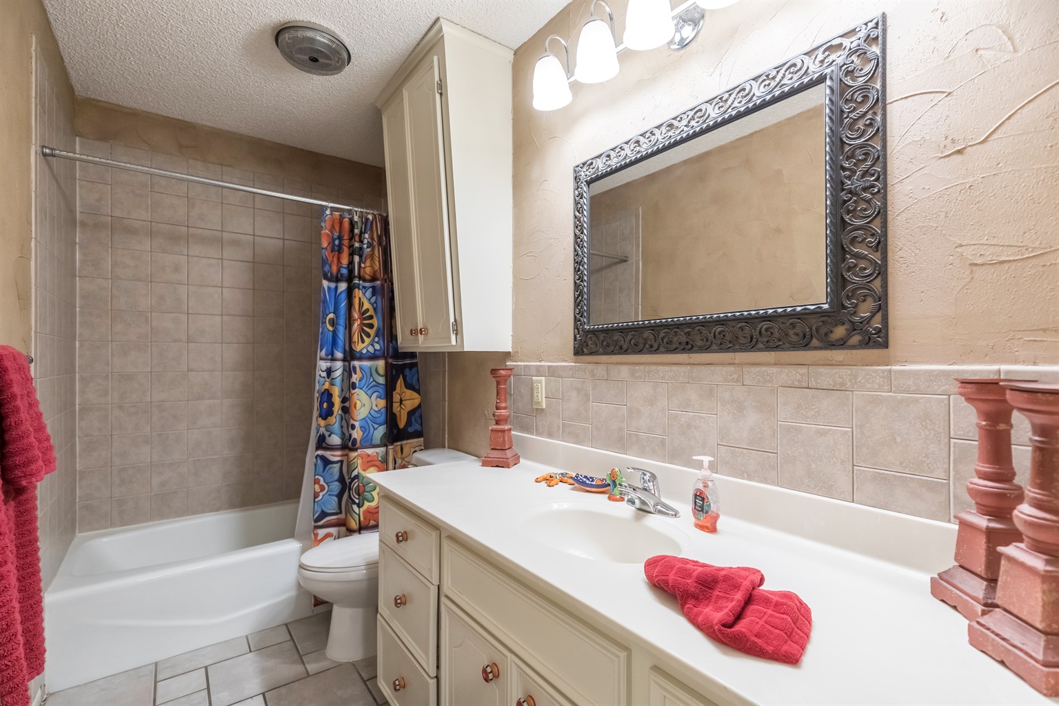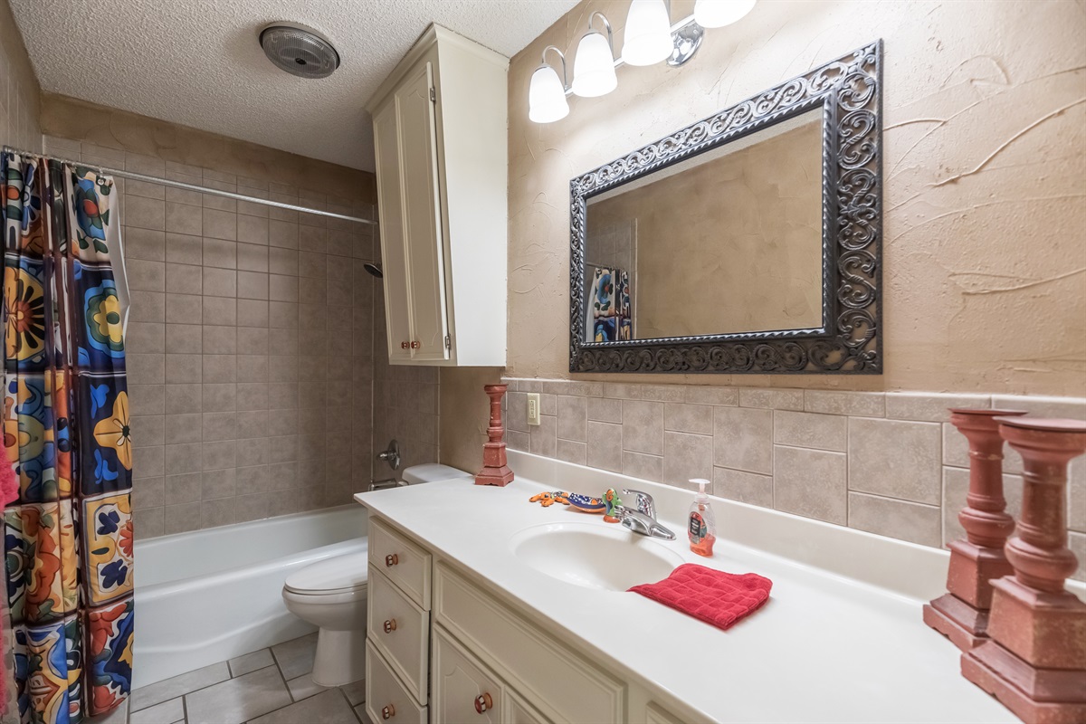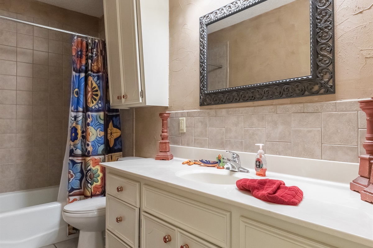 Bathroom 1 (Shared Hall): Full tub/shower combo with a colorful Talavera-inspired curtain, ornate iron-framed mirror, wide vanity with storage, and warm vanity lighting.